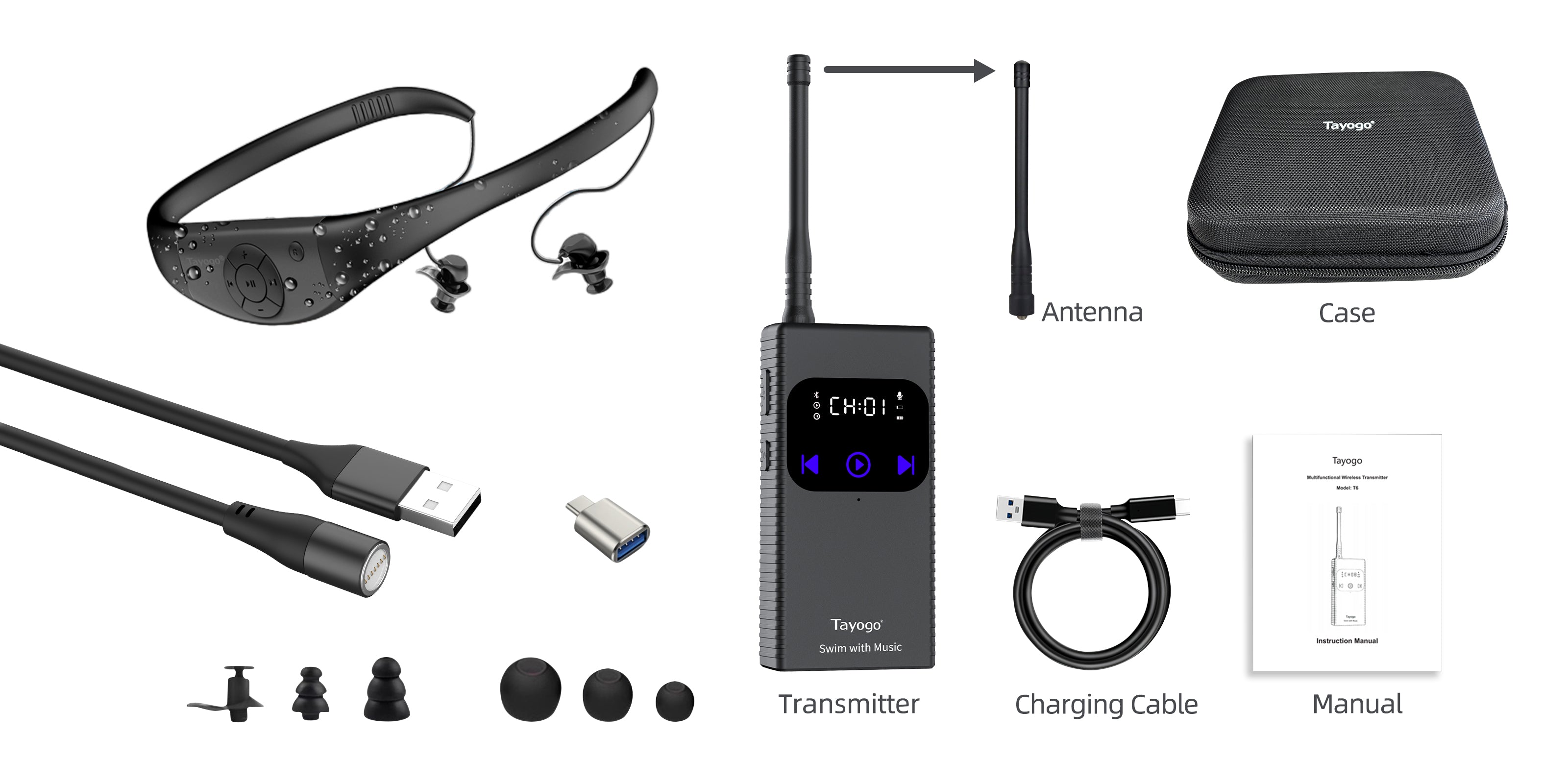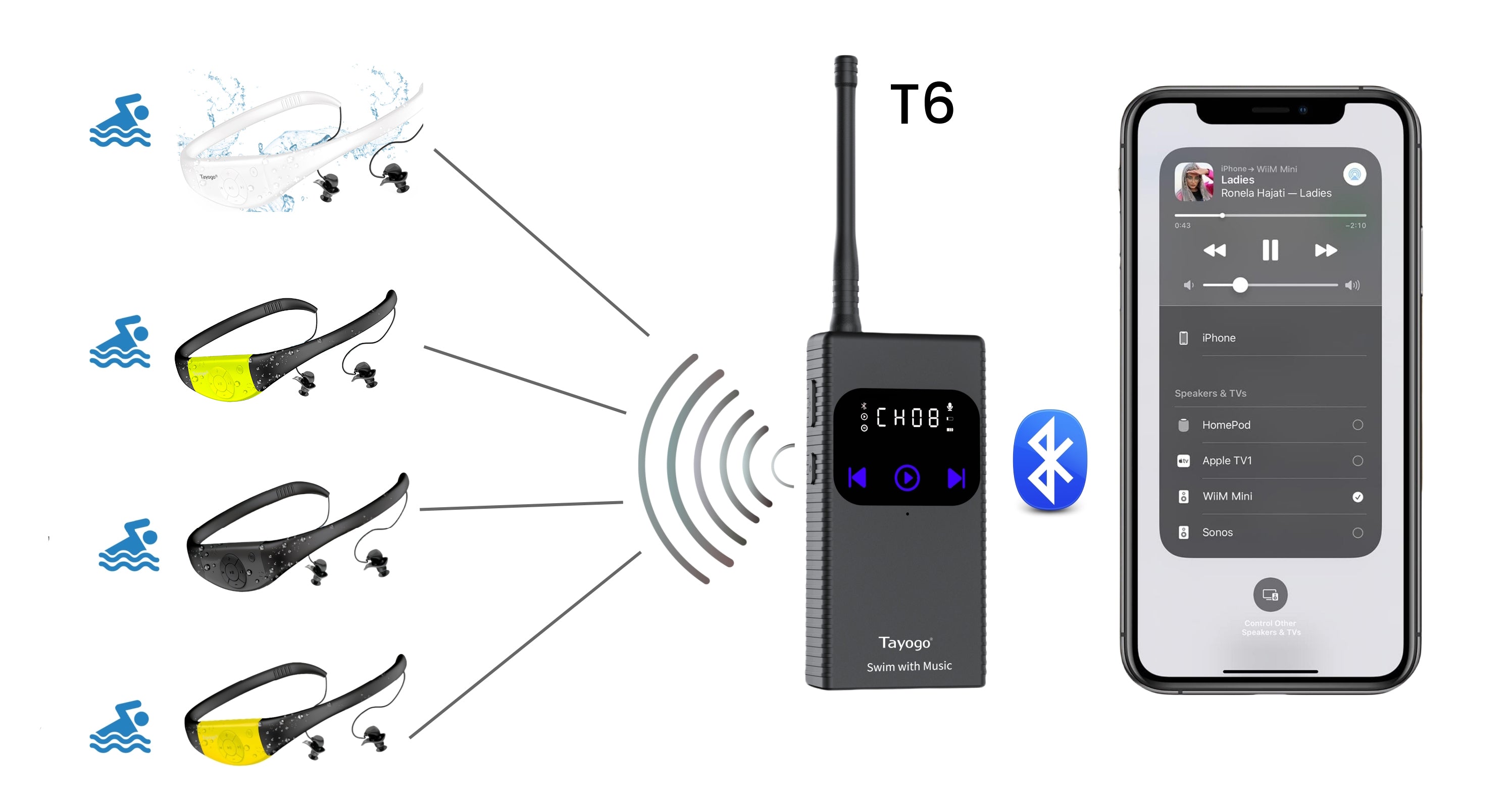 With the Tayogo T6 Wireless Transmitter and Tayogo W16R Waterproof in-ear Headphones, you can stream music from apps like Spotify, Amazon Music, and Audible directly into the water without the hassle of MP3 downloads or losing connection.