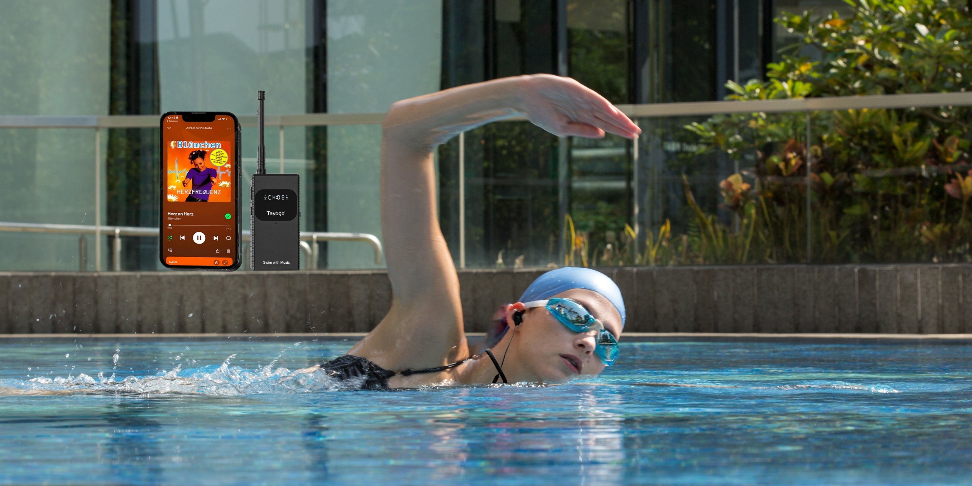 Transmit your stream APP like Spotify, Amazon Music, get it with Tayogo Receiving Headphone under water.