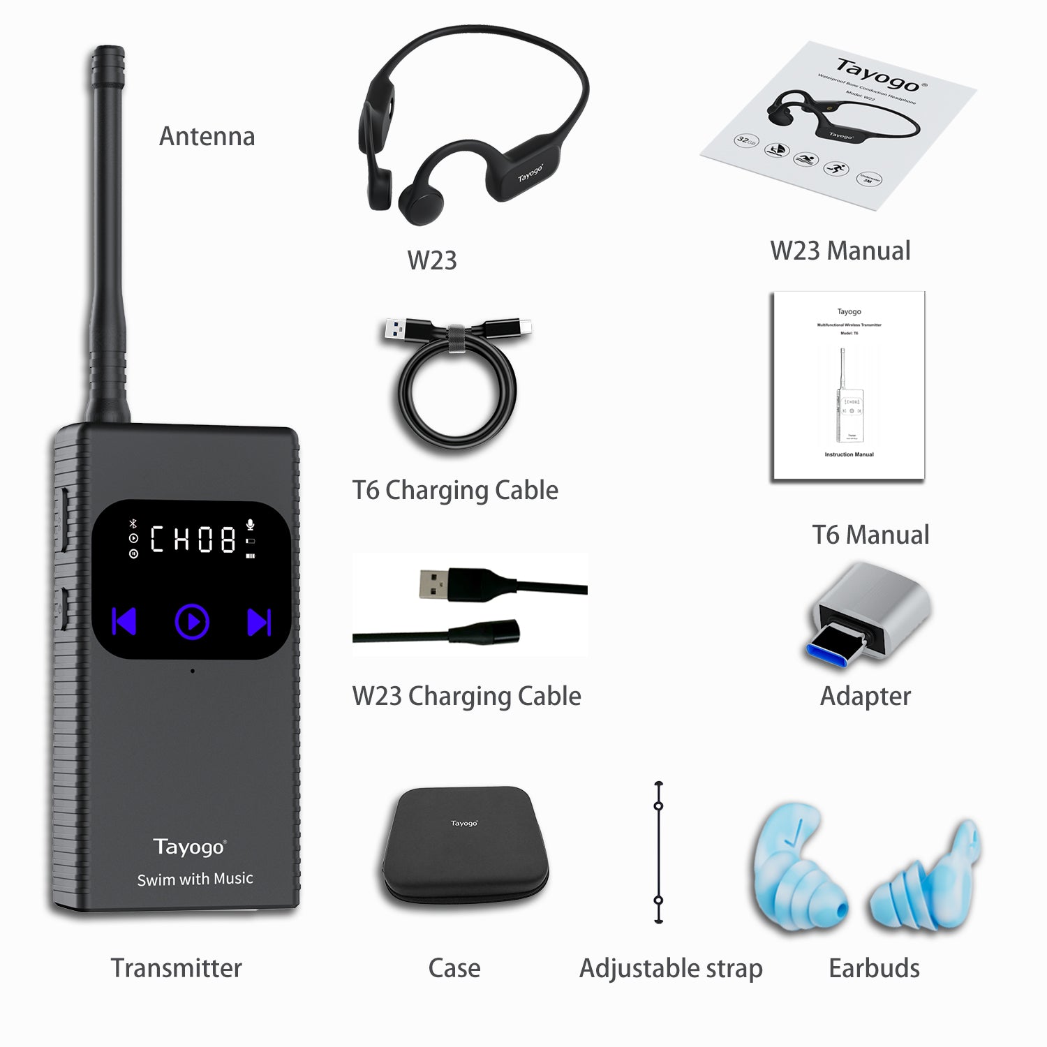 With the Tayogo T6 Wireless Transmitter and Tayogo W23 Waterproof in-ear Headphones, you can stream music from apps like Spotify, Amazon Music, and Audible directly into the water without the hassle of MP3 downloads or losing connection.