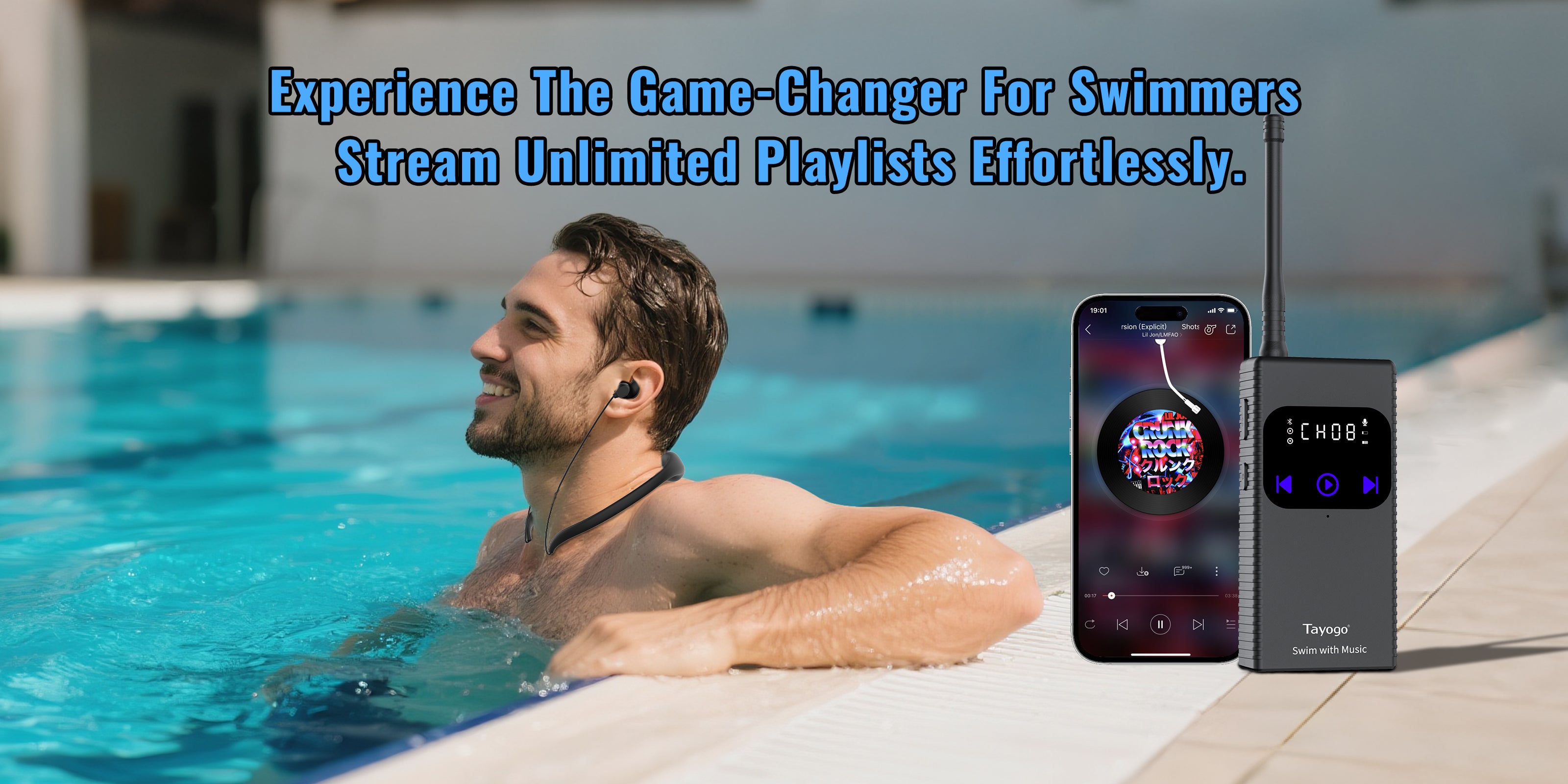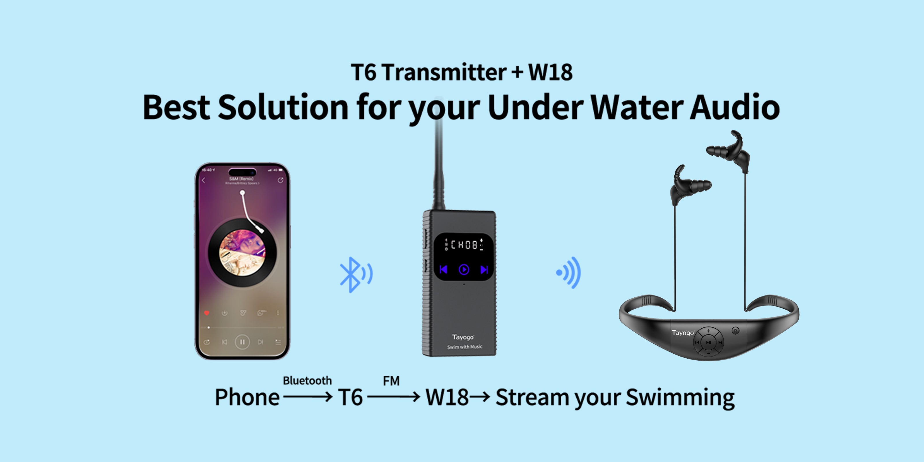 With the Tayogo T6 Wireless Transmitter and Tayogo W18 Waterproof in-ear Headphones, you can stream music from apps like Spotify, Amazon Music, and Audible directly into the water without the hassle of MP3 downloads or losing connection.