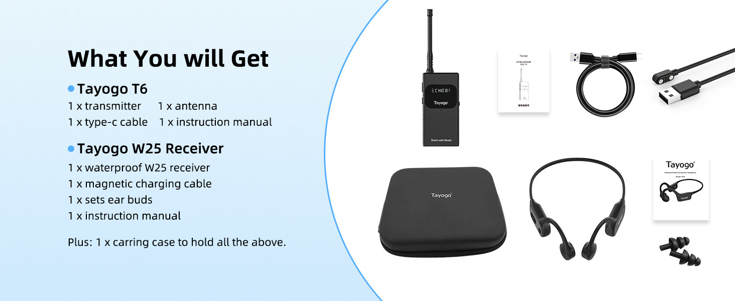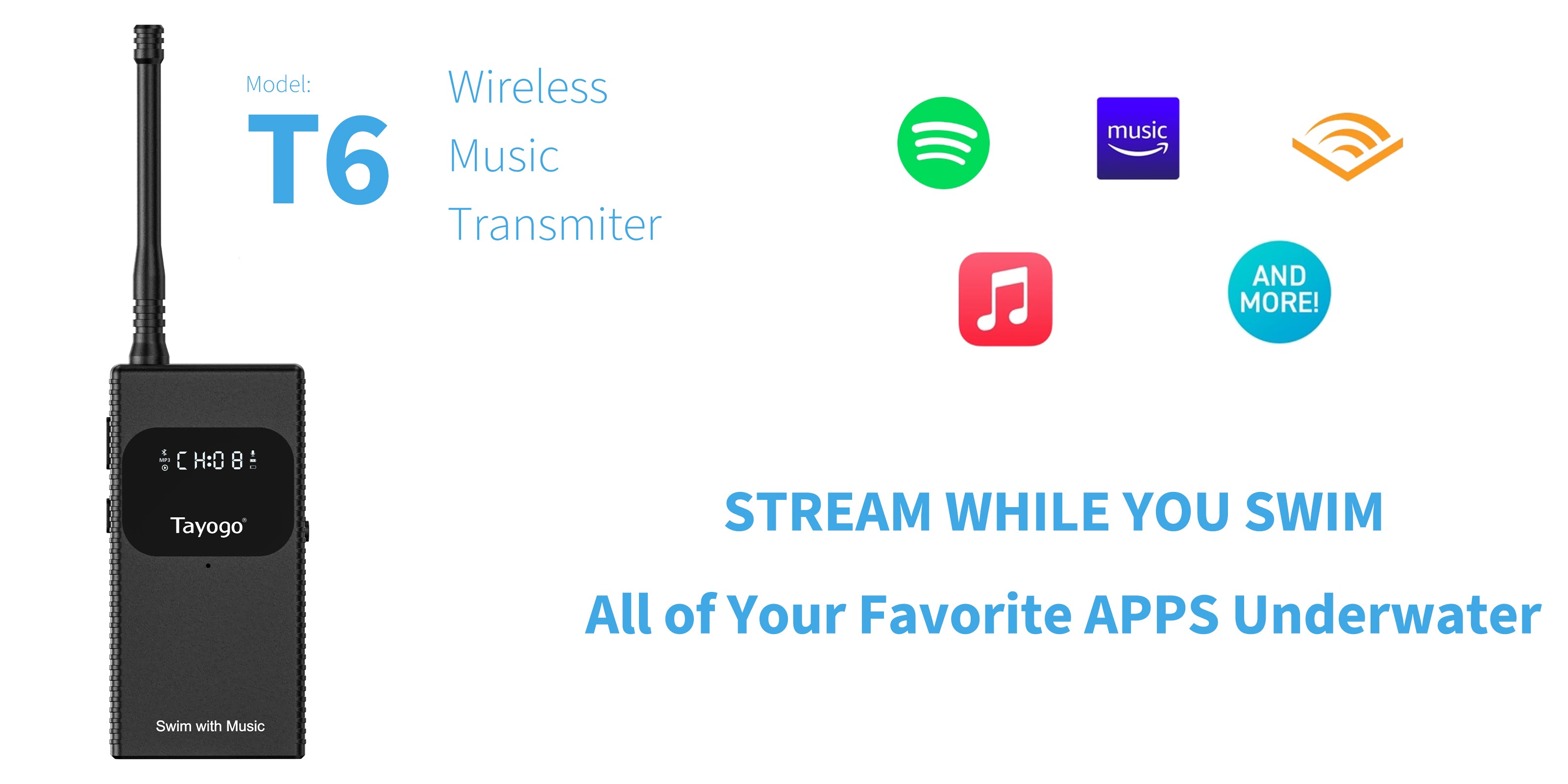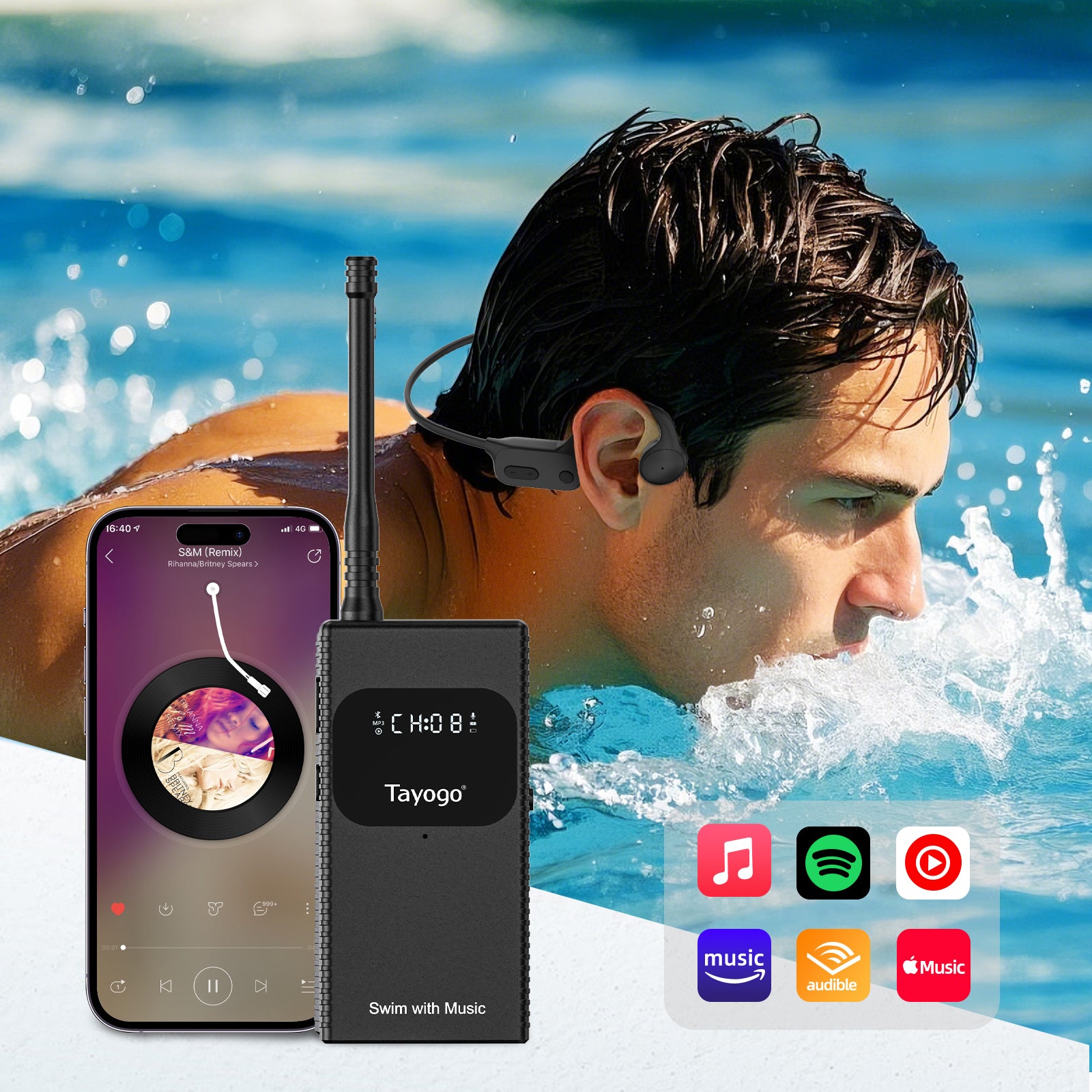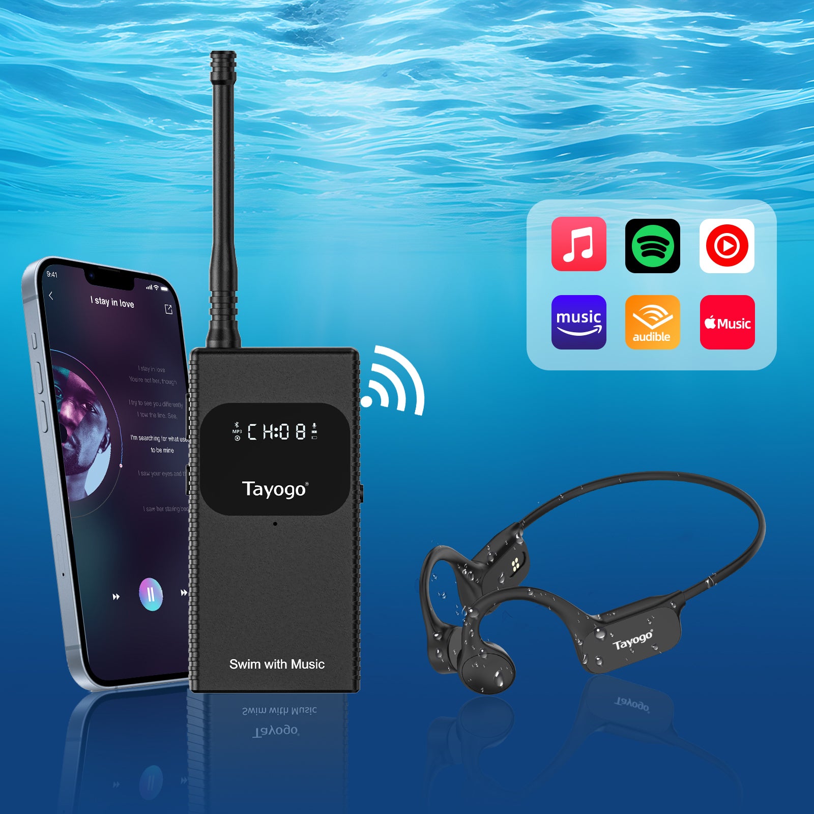 With the Tayogo T6 Wireless Transmitter and Tayogo W25 Waterproof Open-Ear Bone Conduction Headphones, you can stream music from apps like Spotify, Amazon Music, and Audible directly into the water without the hassle of MP3 downloads or losing connection.