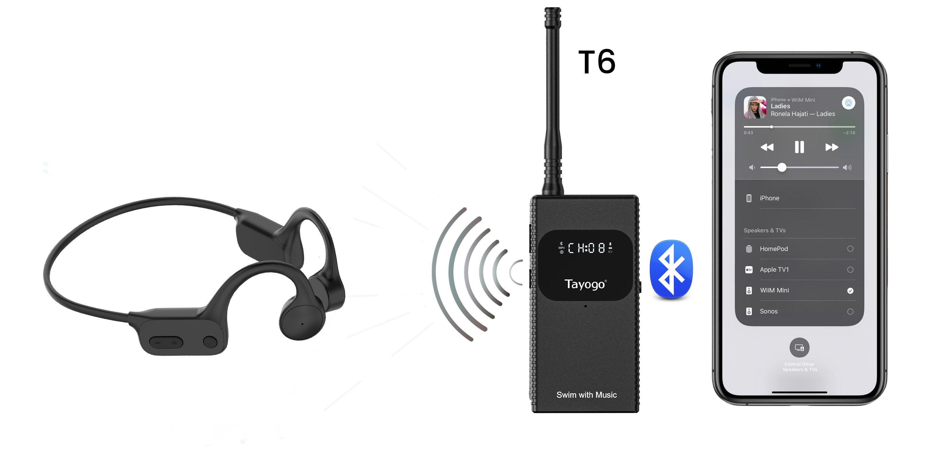 With the Tayogo T6 Wireless Transmitter and Tayogo W25 Waterproof Open-Ear Bone Conduction Headphones, you can stream music from apps like Spotify, Amazon Music, and Audible directly into the water without the hassle of MP3 downloads or losing connection.