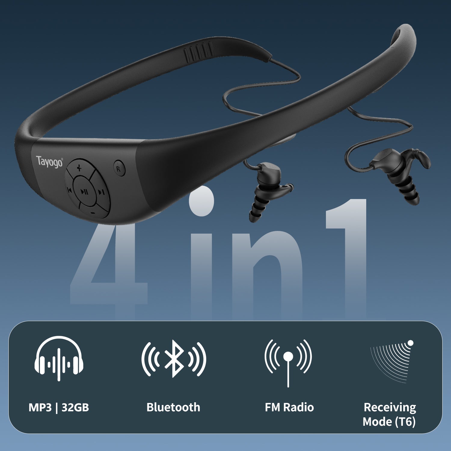 • Receiving Mode – Works with Tayogo T6 Transmitter to receive seamless mobile phone audio while swimming