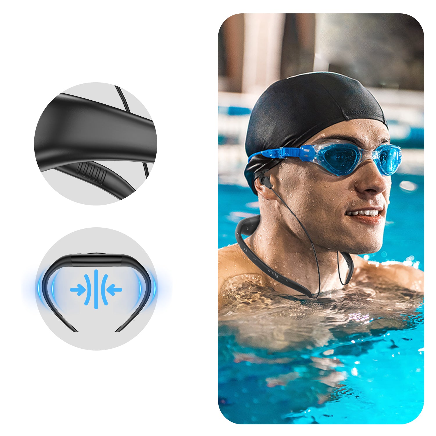 • Wear on Head + Swimming Cap – Wear the headset first, then cover it with a swimming cap for extra security, ensuring it stays firmly in place during intense swimming